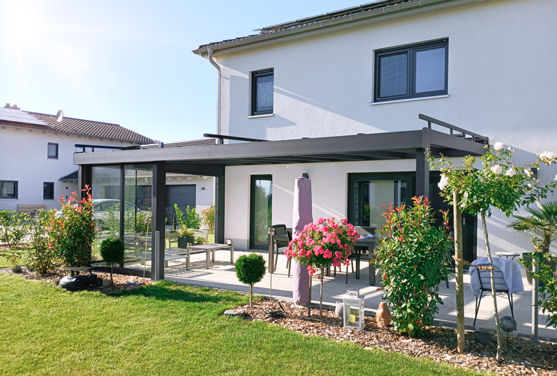 Terrassenüberdachung mit festverglasten Seitenteilen