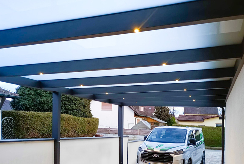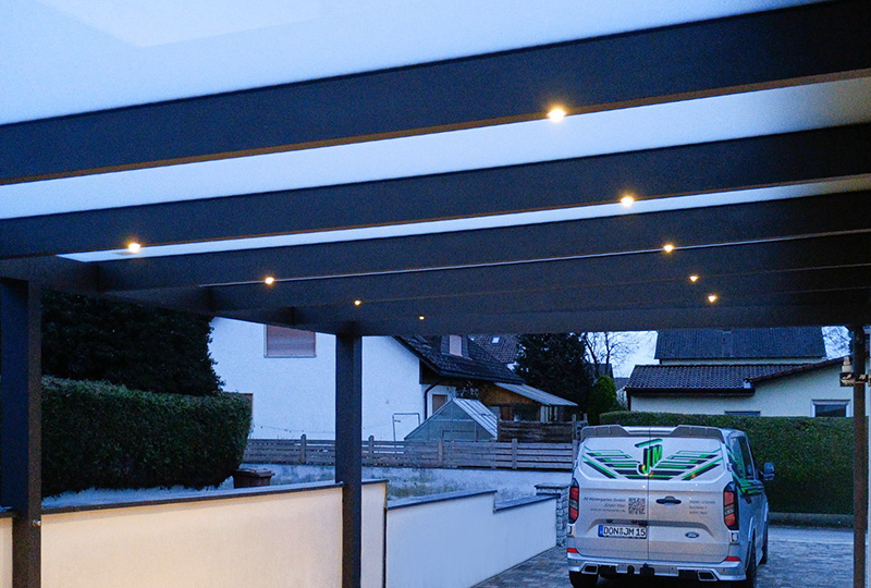 Carport mit Flachdachoptik und VSG 10mm Mattweiß. Umlaufende Rinne und LED Beleuchtung über Bewegungsmelder geschaltet